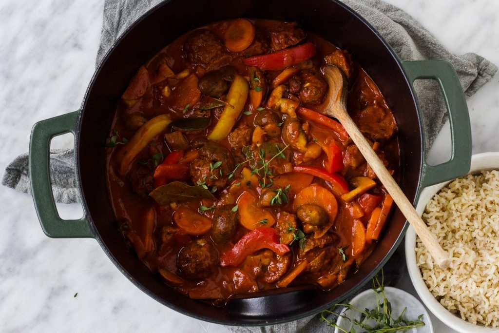 Geurige stoofgerechten, heerlijk op koudere, donkere dagen. Het ultieme comfort food in de winter. Bij stoofgerechten denk je misschien al snel aan vlees, maar je kunt op basis van peulvruchten, groenten of vleesvervangers zoals seitan heerlijke vegetarische stoofgerechten maken. Zelfs bekende gerechten als hachee, goulash en Bourguignon. Dat vind ik een van de leukste dingen aan vegetarisch koken. Deze 5 stoofgerechten zijn zelfs helemaal plantaardig en natuurlijk voedzaam! En nog een voordeel van een vegetarische stoo, deze hoef je niet uren te laten pruttelen.