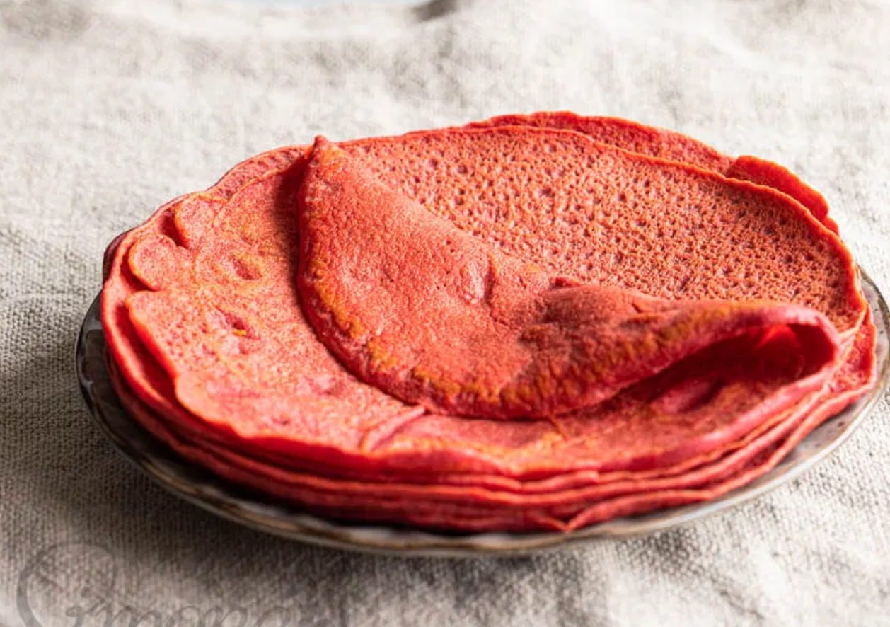 Een paleo versie van wraps maakte ik al eerder. Dus eigenlijk was dit een hele eenvoudige variant erop. Vervang het vocht voor bietenvocht en voila, je hebt een bietenwrap.
