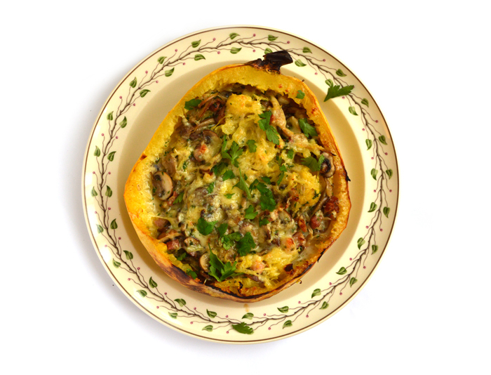 Een flink gevaarte, ovaal, lichtgeel en bijna twee kilo. Netjes doormidden klieven in precies twee even grote helften was nog best even een dingetje. Maar daarna bleek het een makkie. Nu had ik bij eerdergenoemde twee ervaringsdeskundigen natuurlijk even advies ingewonnen. De voorstander had koken in bouillon geprobeerd, maar garen in de stoomoven beviel het beste. Die heb ik niet, dus bij mij werd het de gewone oven. Ik kreeg ook de tip om de sliertjes vooral niet te verdelen over borden, maar gewoon de complete pompoenhelften te serveren, veel handiger.