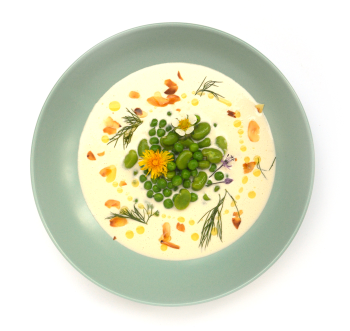 Allebei sierlijk gegarneerd met een bergje seizoensgroente en eetbare bloemetjes. Dat ging ik thuis ook meteen proberen na te maken. Daslook is er intussen natuurlijk niet meer, maar maggikruid bleek een heerlijk alternatief. Heb je dat niet, laat het dan gewoon weg. Verse boontjes had ik ook al niet, maar met die uit de diepvries bleek het ook uitstekend te gaan. Het resultaat is een heerlijk simpel en toch deftig ogend voorgerecht.