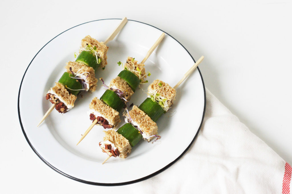 We spicen de sandwich op een stokje wat op met 2 soorten kiemen. Dit maakt de prikkers nog gezonder en feestelijker. We kozen voor broccoli kiemen en rode koolkiemen.