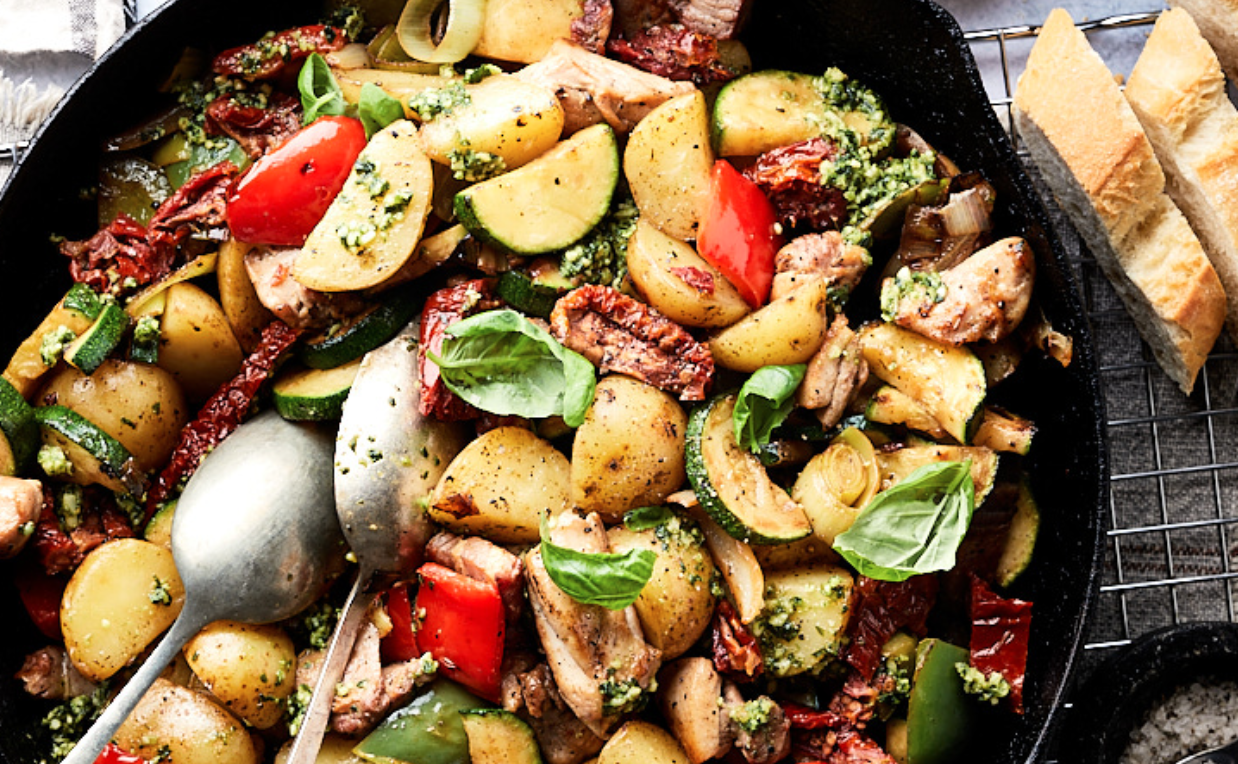 Soms heb je gewoon zin in een makkelijke, goedgevulde maaltijd die niet te veel gedoe is, maar wél vol smaak zit. Dit gerecht is er zo eentje. Kip in ’t pannetje is een heerlijk gerecht waarbij je alles maakt in één pan. Lekker veel groenten, kruidige kip, spekjes voor extra hartigheid en een lepel pesto. Mjam!