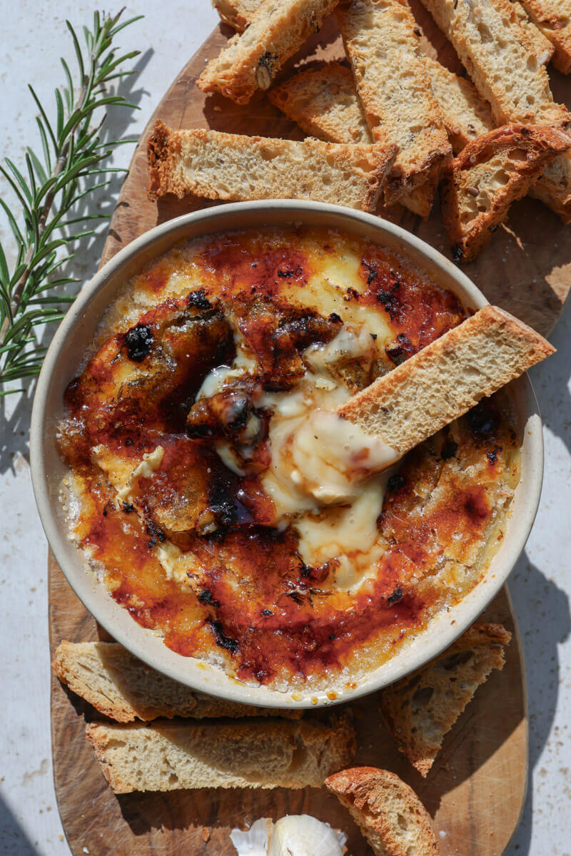 Serveer de camembert brûlé met knapperige reepjes toast en je hebt echt een geweldige borrelhap of een leuk element voor op een kaasplank!