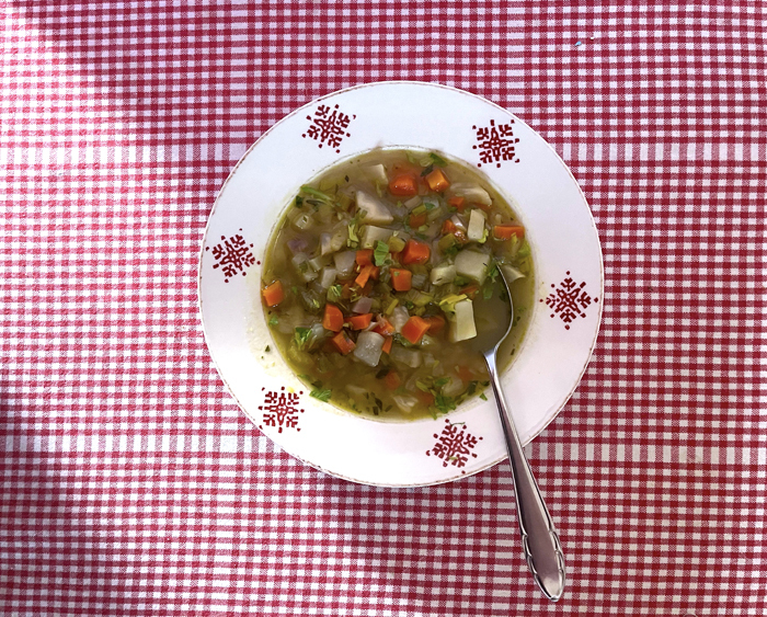 Dat kan mooi allemaal in de groentesoep. Alleen nou eens niet zo’n huphup gepureerde versie, maar juist een sierlijk heldere soep bomvol in liefdevolle blokjes gesneden groente. Ja, inderdaad, dat is even een klusje, maar toevallig heb ik een echtgenoot die een groot talent heeft voor het snijden van keurig petieterige blokjes, dus mocht u thuis ook zo’n exemplaar (m/v) bij de hand hebben, zet die dan vooral aan het werk. Er kan van alles in wat u nog zoal in huis hebt. Ook (juist!) verlepte restjes uit de groentela komen goed van pas, zoals treurige bosjes lente-ui of peterselie, zielige stengels bleekselderij of vergeten worteltjes. Rozemarijn, tijm en laurier zou een mens altijd paraat moeten hebben in tuin, balkonpot of vriezer, die geven lekker veel smaak aan deze bescheiden, maar overheerlijke soep.