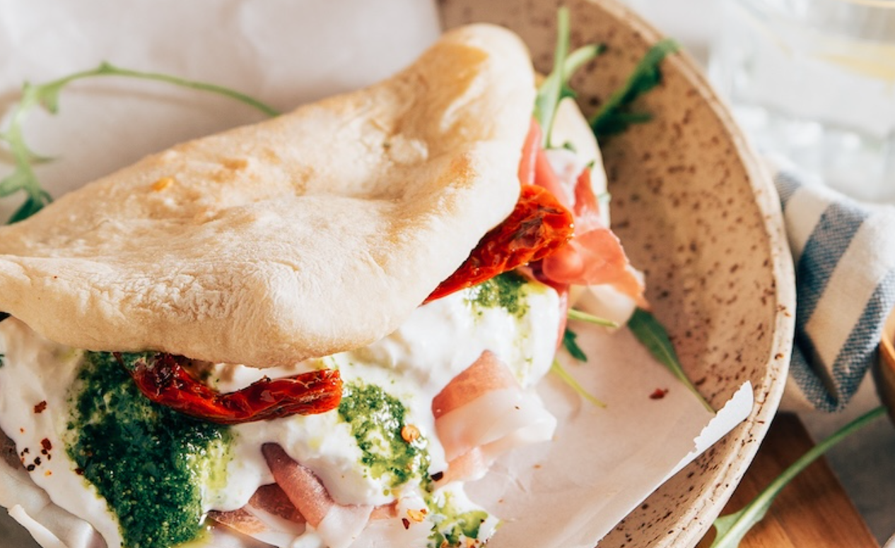 Deze pizza sandwich is geen gewoon broodje, dit is een pizzabroodje 2.0! Denk: luchtig deeg, knapperig gebakken en daarna rijkelijk gevuld met stracciatella kaas, prosciutto, pesto en zongedroogde tomaatjes. Een beetje een Italiaanse streetfood-klassieker, maar dan gewoon homemade.