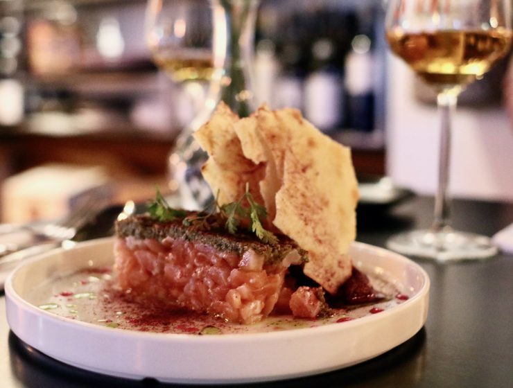 Ik heb ooit met Sandra (eigenaresse) samengewerkt bij Bar Madrid in Utrecht en ik vind het mega tof dat ze nu haar eigen restaurant is begonnen samen met Ramon, de andere eigenaar. Ramon staat in de keuken. Bij het brengen van de gerechten vroegen Mike en ik hem de oren van het hoofd over ingrediënten en bereidingswijzen (hahaha sorry Ramon!) en zo kwamen we erachter dat deze man echt weet wat hij doet. Zijn gerechten zijn bijzonder, vol smaak en zoveel mogelijk gemaakt met verse en schone ingrediënten. De menukaart wisselt continue, maar ik hoop echt dat de Inktvis Inkt Veloute op de kaart blijft. Ik kreeg het geheel alleen met geen mogelijkheid mooi op de foto (want: pikzwart), maar dit gerechtje met malse inktvisjes in romige saus moet echt je proeven als je hier bent. Je krijgt er geroosterd brood bij om die heerlijke saus mee op te dippen. Met dat ik dit schrijft krijg ik gewoon weer honger. Mike en ik laten ons zoals altijd graag verrassen als we uit eten gaan en leuke is dat je dan soms gerechten voorgeschoteld krijgt die je zelf niet zo snel zal bestellen. Zo had ik zelf bijvoorbeeld nooit de Baskische worst met bladerdeeg en appel genomen (ik ben niet zo van de worst), maar ook dit vond ik heeeel lekker.