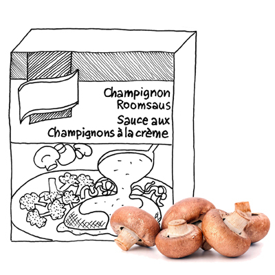 In de supermarkt stuitte ik op vierkante pakjes champignonsaus. De inhoud blijkt verrassend vergelijkbaar met de aloude zakjes, alleen is daar het water uitgehaald zodat u dat weer zelf kunt toevoegen, en hier zit het er nog in, als hoofdingrediënt. En verder als vanouds veel maïszetmeel, aardappelzetmeel, emulgator en verdikkingsmiddelen om de boel smeuïg bij elkaar houden, zodat die room er voor spek en bonen bij zit.