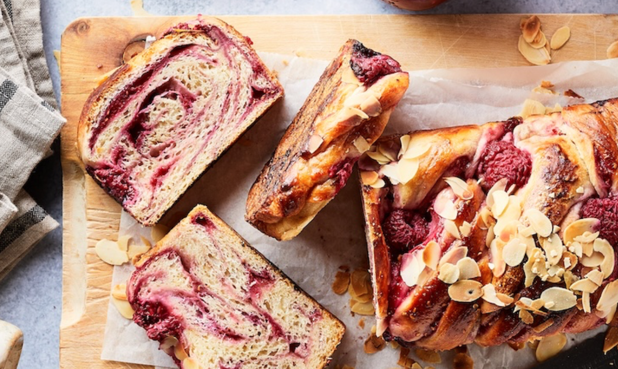 Er gaat niets boven de geur van versgebakken briochebrood. Dit zachte, lichtzoete brood met een vleugje vanille en citroen geven we een megalekkere twist door een laagje zelfgemaakte frambozenjam en een krokante topping van amandelschaafsel. Perfect als luxe ontbijt, bij de brunch of gewoon als verwenmomentje bij de koffie.