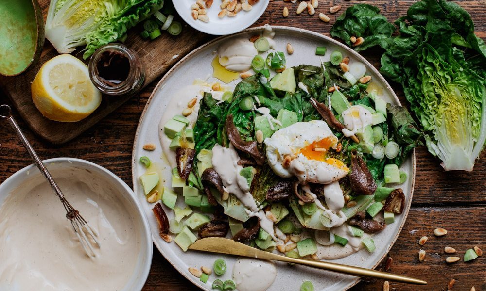 Gegrilde little gem met tahin-yoghurtdressing en dadels. Deze goedgevulde salade is heerlijk als lunch en een echte smaakbom. Little gem (ook wel romaine sla of bindsla genoemd) is een knapperige en lichtzoete slasoort. Deze kleine sla schuitjes kan je natuurlijk gewoon rauw eten, maar je kunt ze ook doormidden snijden en kort grillen. Worden ze nét even wat lekkerder van. Doe daar een homemade dressing bij gemaakt van tahin (sesampasta) en yoghurt, een gepocheerd eitje, ansjovis, zoete dadelreepjes en je hebt een ge-wel-dige maaltijdsalade. Oh, en vergeet de lente ui en geroosterde pijnboompitjes niet. Die maken deze gegrilde little gem met tahin-yoghurtdressing en dadels echt next level.