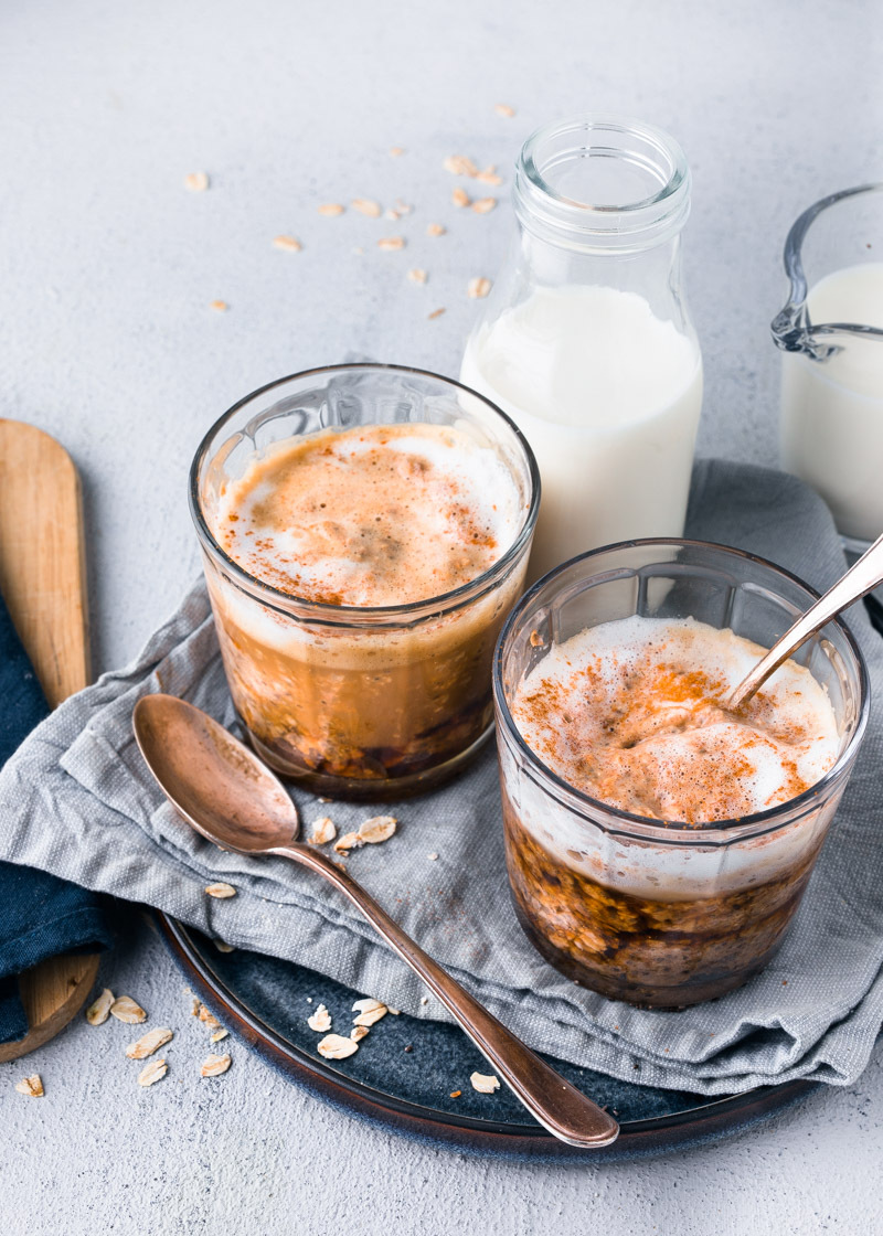 Ben jij een echte koffie fan? Dan is dit recept echt iets voor jou, het is je morning koffie en ontbijt samengevoegd in een overnight oats recept: wij noemen het “macchiato oats”. Dat klinkt goed toch? Overnight oats zegt het eigenlijk al, je maakt het ontbijtje eigenlijk de avond van te voren. Zet het in de koelkast en de volgende dag kun je het direct eten. Om dit ontbijtje op een macchiato te laten lijken is het leuk en lekker om ’s ochtends het laatste beetje melk op te schuimen. Wanneer je een melkopschuimer hebt kun je die gebruiken. Natuurlijk kun je ook de melk in een steelpannetje opwarmen dan mis je een beetje het schuimeffect, maar is ook heel lekker. Dit is recept is voor 2 personen. Je kunt de overnight oats ook echt heel goed langer bewaren. Wanneer je het een lekker recept vindt kun je in 1 keer voor een paar dagen maken en de overnight oats in een bakje in de koelkast bewaren. Wil je het recept alleen voor jezelf maken, deel dan alle hoeveelheden door 2. Natuurlijk kun je dit recept super gemakkelijk vegan maken door een plantaardige melk te gebruiken in plaats van gewone melk.