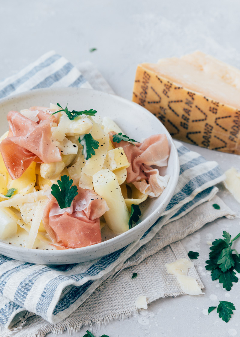 Asperges met ham en ei, een echte klassieker. Dit recept is een leuke twist daar op, pasta met asperges, prosciutto en een heerlijk Italiaans kaasje om het af te maken. Zo krijgt deze Hollandse klassieker ineens een Italiaanse twist. En dat is zeker het proberen waard. Als basis gebruiken we papardelle, maar je kunt natuurlijk ook andere pastasoorten gebruiken. We maken een sausje van room, knoflook, ui en Grana Padano. Dit is een lekkere smaakmaker en geeft de pasta met asperges een lekkere, hartige smaak.