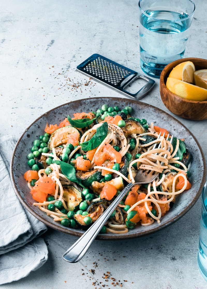 Zin iets lekkers wat supersnel bij jou op tafel staat? Maak dan deze pasta met zalm en roomkaas. Dit gerecht staat binnen 20 minuten bij jou op tafel. Wij gebruikten als pasta spaghetti, maar wanneer je macaroni, linguine of farfalle (vlindertjes pasta) in de voorraadkast heb staan kun je die ook gebruiken. Voor dit recept gebruik je gerookte zalm, die kun je zelf in reepjes snijden of je koopt zalmsnippers. Een andere hele lekkere variant is de gerookte zalm te vervangen door warmgerookte zalm. Die hoef je alleen in stukjes te breken. Kook voor het recept de pasta zoals aangegeven op de verpakking en gebruik flink gezouten water: Noordzee smaak. Zo geef je de pasta zelf ook wat smaak mee. Wanneer je te weinig zout gebruikt tijdens het koken van pasta, blijft de pasta heel smaakloos. Dus even het water proeven voordat je de spaghetti in de pan doet. De courgette bak je kort in een de koekenpan tot de stukjes een kleurtje krijgen en de doperwten hoef je alleen maar op te warmen. Giet de pasta af, schep de roomkaas en citroenrasp erdoor en meng met de groenten. Tot slot verdeel je de gerookte zalm er over. Supersnel klaar dus.