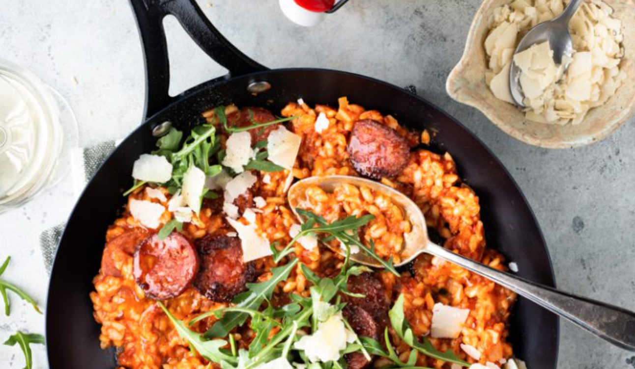 Houd je ook zo van risotto? Alle Italianen moeten maar even wegkijken, want we delen vandaag het recept voor een romige risotto met chorizo. Niet Italiaans, eerder Spaans, maar vooral heel lekker. We garen de risotto in tomatenblokjes, saffraan en bouillon. Echt heerlijk is dat! In een klassieke risotto blus je de rijst af met wijn, dat geeft extra smaak, maar je kan het gerust achterwege laten als je liever geen wijn wil gebruiken. De chorizo bakken we lekker knapperig in een droge koekenpan. Al met al een heerlijke smaakbom. Liever een klassieke risotto? Kijk hier dan eens voor nog meer inspiratie.