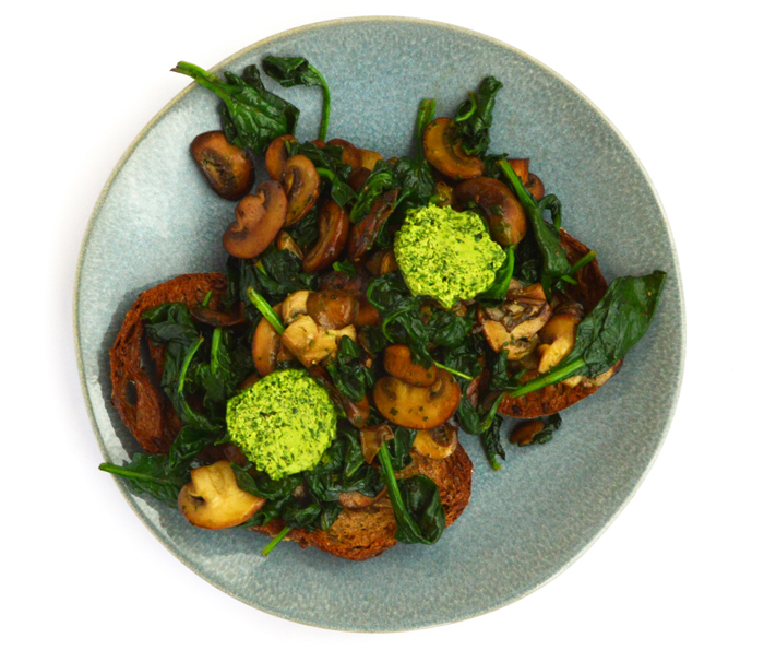 Lekker koken in je uppie, het is voor veel mensen een opgave. Daarom nu speciaal een recept voor een eenpersoonslunch die ook moeiteloos kan worden opgewaardeerd tot lichte avondmaaltijd: geroosterd brood met gebakken champignons en spinazie, afgetopt met daslookboter.