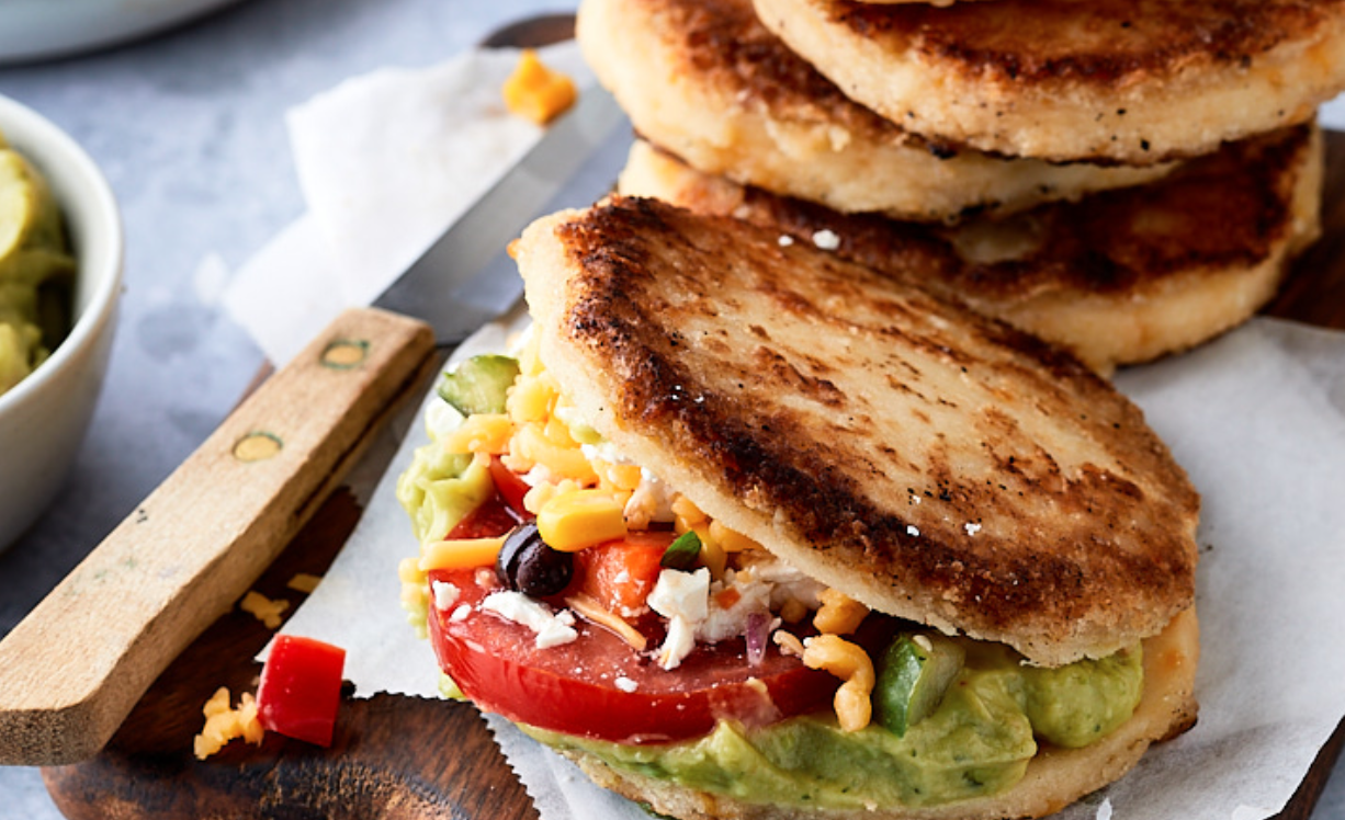 Heb jij al eens arepa’s gegeten? Dit is een Zuid-Amerikaans maïsbroodje dat je zeker lekker zal vinden! Onze versie vullen we met guacamole, tomaten, een simpele Mexicaanse bonensalade en feta.