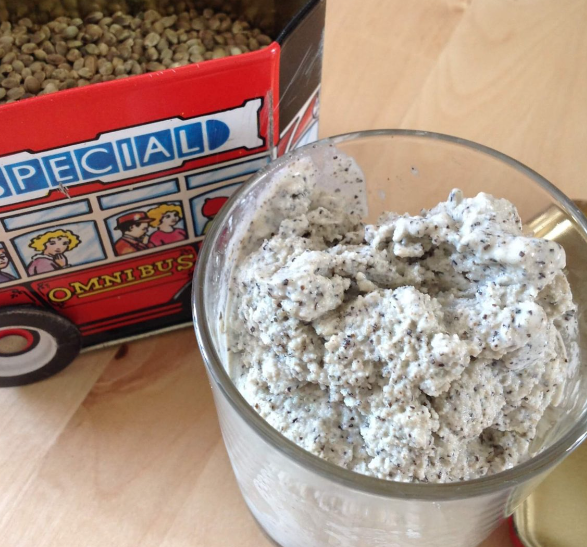 Hennepzaad is erg gezond. Het bevat namelijk veel proteïnen en gezonde vetzuren. Je kunt hennepzaad gepeld of ongepeld kopen. In het schaaltje schijnen ook veel gezonde stoffen te zitten en ik had toevallig ongepeld zaad in huis, daarom heb ik de ongepelde versie gebruikt. Je kunt ook gepeld hennepzaad nemen. Dan krijg je geen zwarte stukjes schaal in je ijs.