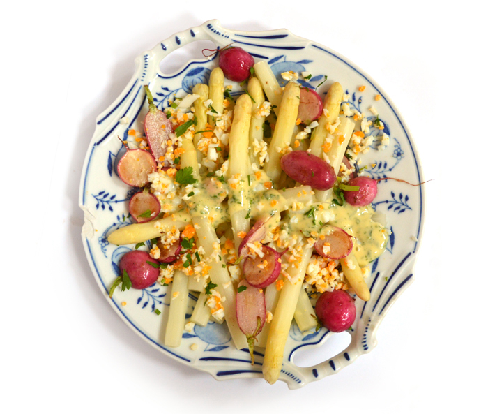 Om te beginnen asperges met radijs en mierikswortelsaus. Asperges met radijs, hoe verzin je het? Nou kijk. Recepten ontstaan meestal toevallig, omdat je dingen hebt waar je vanaf wilt en vervolgens gaat kijken wat er nog meer rondslingert voor erbij. Dat is voor mij de essentie van koken: creatief bezig zijn met dankbaar (lees: opeetbaar) resultaat en intussen kom je mooi van je rotzooi af ook. Ik kan er niet bij dat wij gemiddeld nog steeds per persoon veertig kilo voedsel per jaar weggooien. Aan mij zal het niet liggen, mijn motto is: overal valt nog wel wat van te maken. Ik had nog radijs in huis en geraspte mierikswortel in de vriezer. Dus voilà.