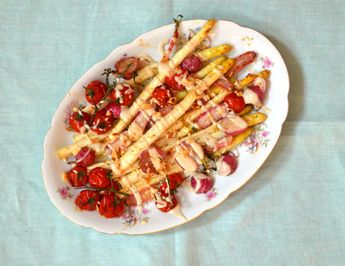 Nooit niks weggooien mensen. Vandaag nog een keer een recept met asperges en radijs, puur omdat ik die allebei over had. Alleen maak ik er nu natuurlijk iets geheel anders mee dan het recept van gisteren.