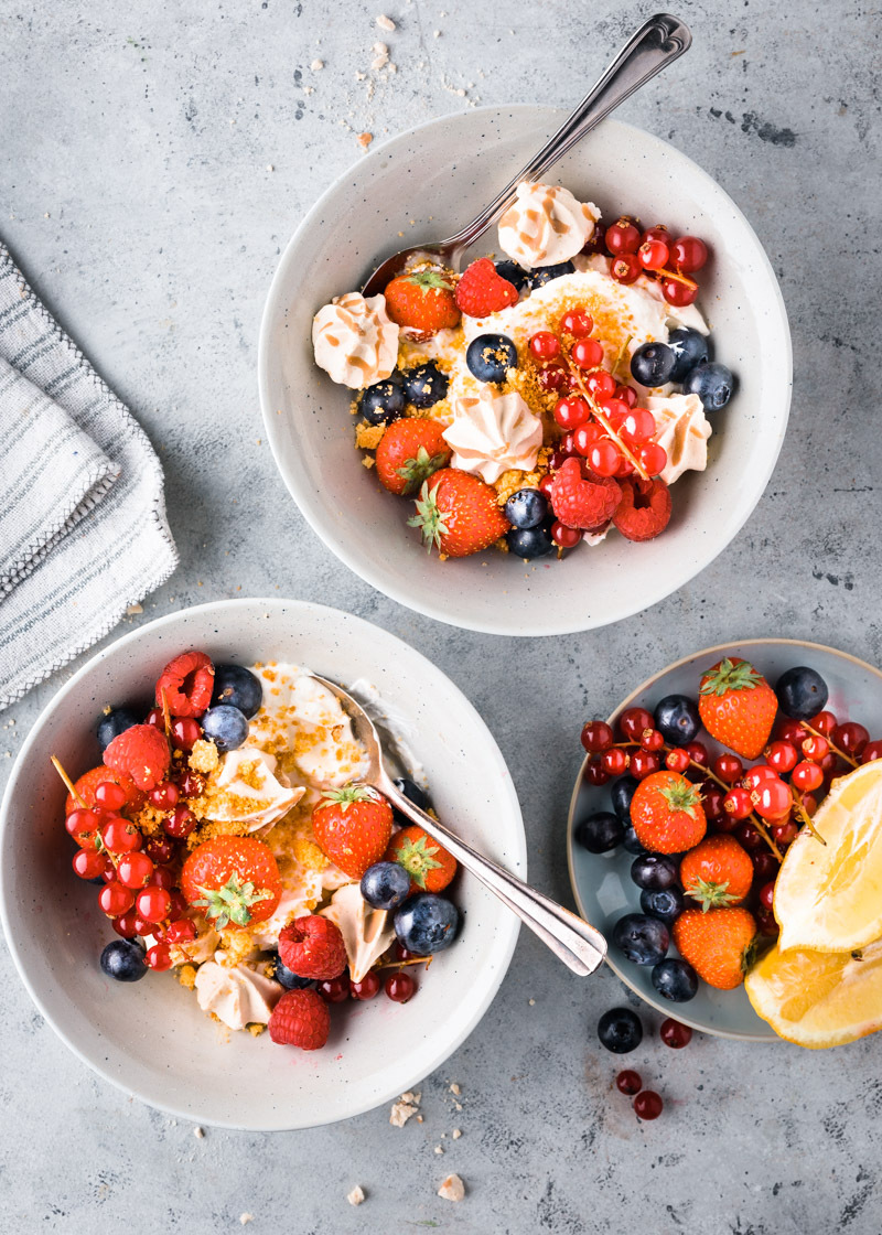 Hangop is zo’n gemakkelijk en lekker toetje om te maken dat het bijna geen recept mag heten. Maar toch is het ontzettend leuk om te delen omdat je er zo lekker snel mee klaar bent en werkelijk iedereen vind het lekker. Het enige is, je moet het de avond van te voren even doen. Wat is hangop? Hangop is een zuivelproduct dat je in een schone theedoek schept die je boven een schaal of mengkom laat uitlekken. Je kunt de theedoek ook aan de punten ophangen om uit te laten lekken, vandaar de naam hangop. Na een nachtje uitlekken krijg je een ingedikte soort kwarkachtige yoghurt. Wij maken hangop altijd van een emmertje Griekse yoghurt. Aan de yoghurt kun je smaakje geven, zoals citroen in dit geval. Het sap en de rasp meng je door de yoghurt voordat je hem in de theedoek stort. Gebruik overigens wel een schone theedoek en bij voorkeur een die niet met wasverzachter of een wasmiddel met sterke geur gewassen is (de hangop neemt die geur/smaak aan). De volgende dag schep je de yoghurt uit de theedoek in de schaaltjes en versiert het met vers fruit, meringue en verkruimelt er een hazelnootkoekje over. Super lekker!