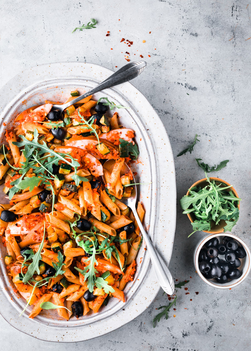 Deze pastasalade met gerookte kip staat binnen 20 minuten bij jou op tafel! Je kunt hem lauwwarm of koud eten. En daarmee is deze salade ook gemakkelijk van te voren koken of kun je hem bewaren voor een lunch de volgende dag. Het is een soort pasta pesto pesto salade maar dan met tapenade. Deze maak je heel snel in het hakmolentje van de staafmixer. Hiervoor gebruik je gegrilde paprika’s uit een pot, olijven en amandelen. Het is ook een heerlijk smeersel voor op een toastje of je boterham. Je leest het al, je bent dus heel snel klaar. Nog even de pasta beetgaar koken en alles door elkaar mengen. Snijd de gerookte kip in plakjes of stukjes en garneer de pastasalade met een flinke hand rucola, een drizzle van je favoriete olijfolie en nog wat extra olijven.