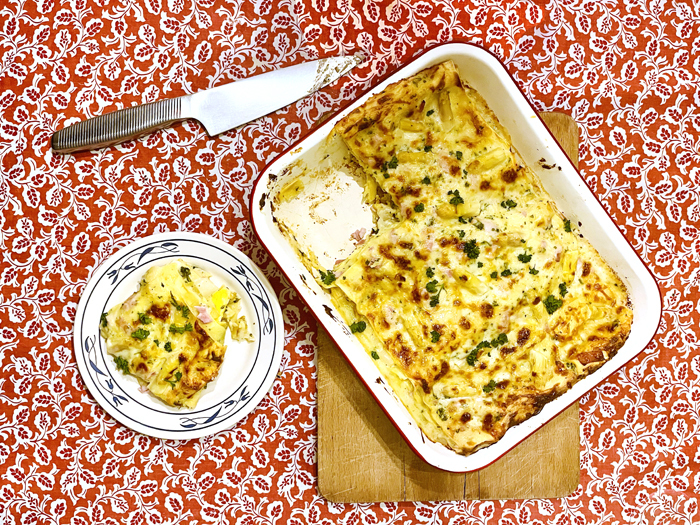 De pistachelasagne die ik laatst in de krant had, dat leek me een goed idee. Pastavellen, melk, boter, bloem, pistachenootjes, geraspte kaas: alles had ik in huis, alleen niet de bijbehorende groente. Maar ik had wél asperges, ham en eieren. Zou ik die niet in lasagnevorm kunnen verwerken? Weer eens wat anders dan de klassieke versie à la flamande. De schillen en kontjes van de asperges liet ik eerst even trekken in de melk voor de bechamelsaus, en ach, toen kon ik net zo goed de asperges zelf ook erin koken, in plaats van in water. Zo werd het geheel nóg aspergeriger. En verhip, het werkte als een tierelier.