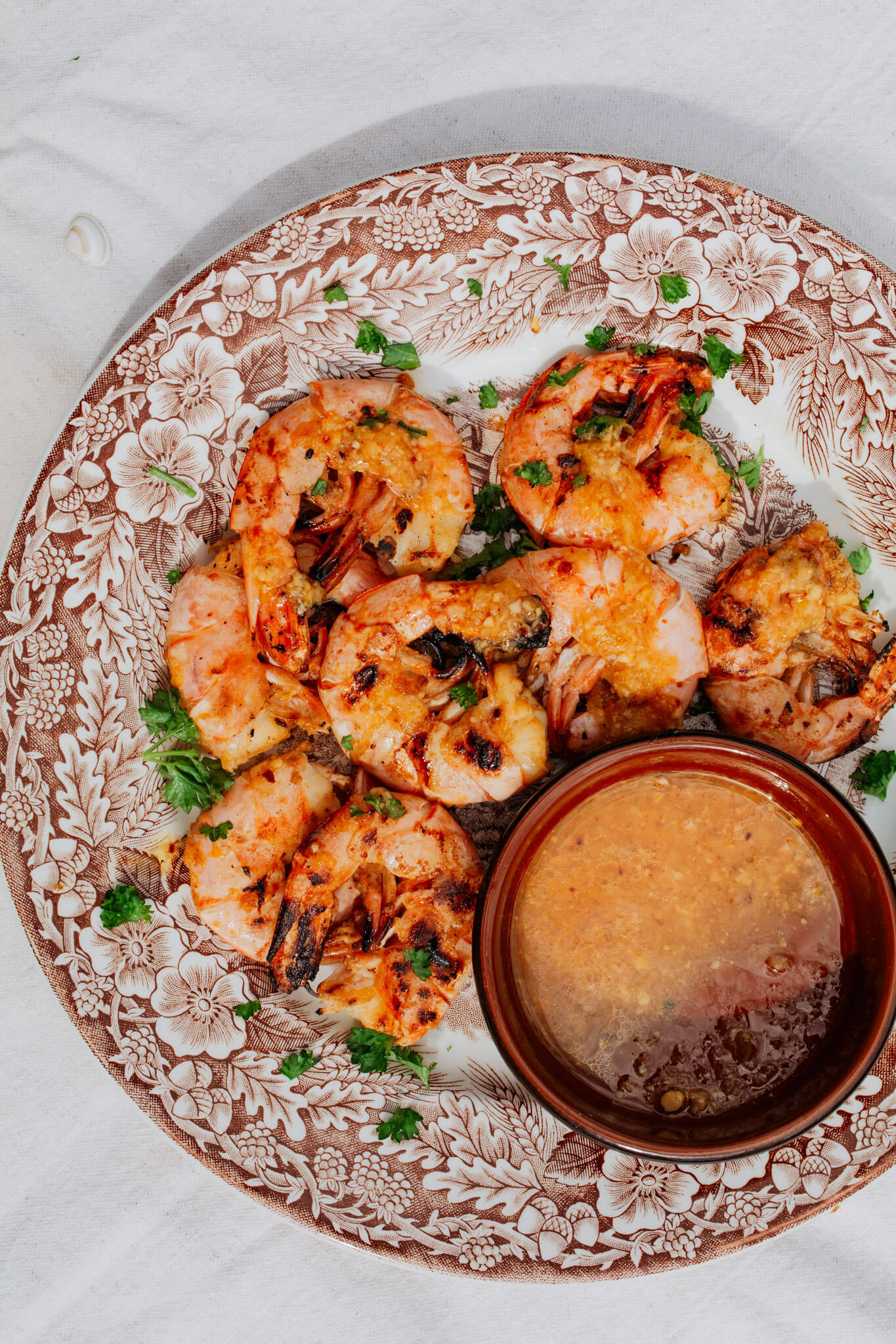 Wat mij betreft zijn Argentijnse garnalen dé koning onder de garnalen. De Argentijnse gamba is een van de grotere garnalen soorten, die wel 20 centimeter lang kan worden. Het vlees is stevig van structuur en is onwijs sappig. Een wereld van verschil in smaak en structuur met kleine kweek garnaaltjes. De Argentijnse garnaal heeft een heerlijk lichtzoete smaak en is van zichzelf prachtig rood van kleur. Het is een wilde garnaal die wordt gevangen voor de kusten van Argentinië. Ik koop ze zelf bij de groothandel (Sligro of Hanos), maar je kunt ze ook bij de visboer kopen of anders online. Mocht je ze niet op de kop kunnen tikken, gebruik dan black tiger garnalen! Die zijn qua smaak vergelijkbaar, alleen is de Argentijnse garnaal voor het koken al rood/oranje van kleur. Qua smaak vind ik het net kleine mini kreeftjes, zó lekker.. Ik serveer ze tijdens etentjes ook wel eens rauw! Dan haal ik er aan tafel alleen nog even een brandertje over zodat ze licht geschroeid zijn. Goddelijk. Enfin, vandaag maken we ze van de barbecue!