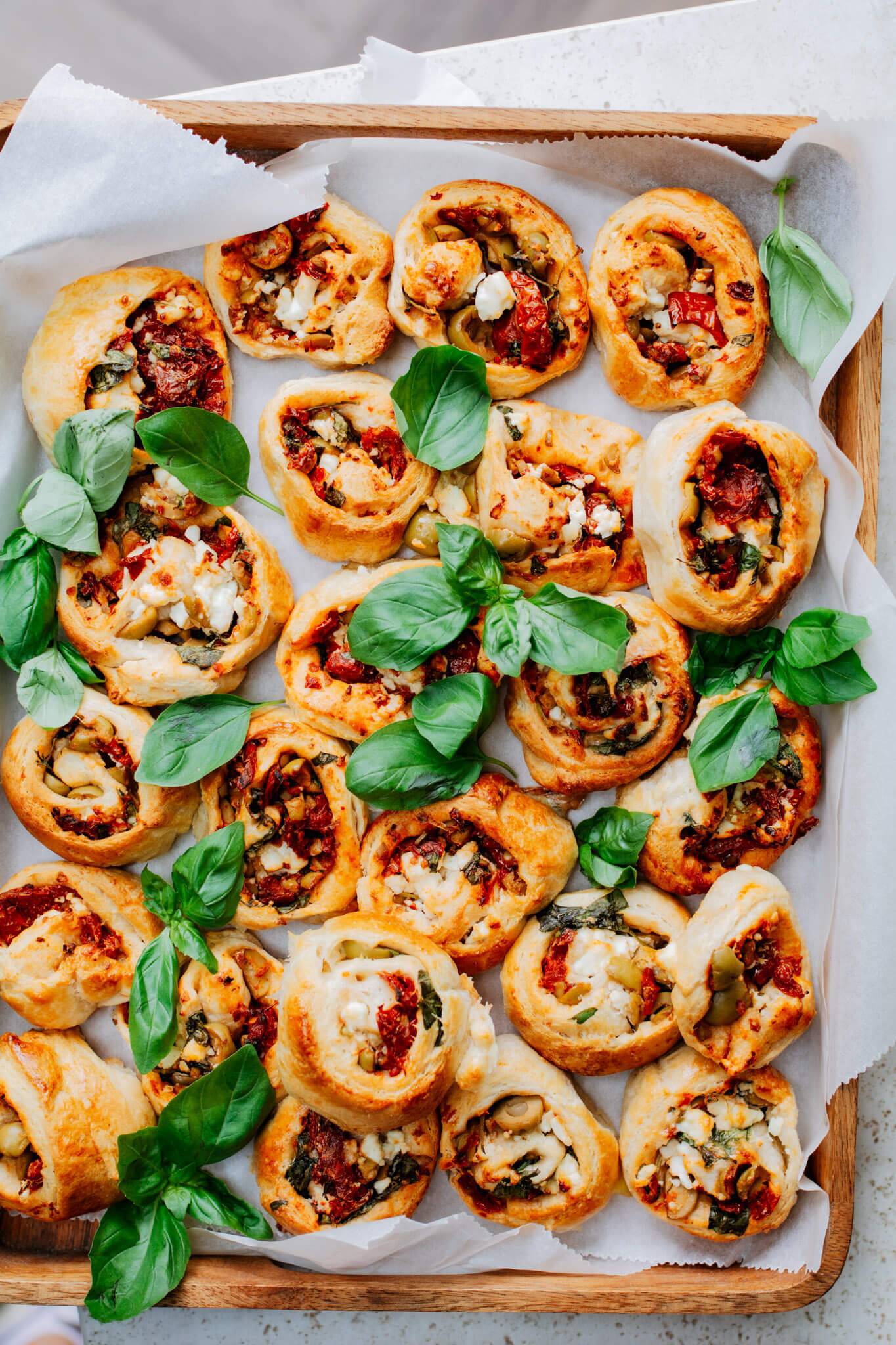 In de supermarkt greep ik oorspronkelijk naar een rol kant en klaar bladerdeeg, maar ik bedacht me dat de borrelbroodjes misschien luchtiger zouden worden als ik croissantdeeg zou gebruiken. And they DID! Wauw, wat een heer-lijk luchtige borrelbroodjes krijg je van croissantdeeg. Nog een voordeel: ook koud blijven de broodjes lekker smeuïg. Ideaal ook voor een picknick. Voor dit recept gebruiken we twee rollen XXL croissantdeeg. Die leg je naast elkaar zodat je één grote lap hebt. Daarna beleggen we het deeg met fijngehakte zongedroogde tomaten, olijven, feta en verse basilicum. Verse oregano is ook heerlijk! Even oprollen, in plakjes snijden en klaar is kees. Om de rol in plakjes te snijden raad ik je aan om gebruik te maken van een stukje (keuken)touw. Hierdoor ‘snijd’ je het deeg heel makkelijk in mooie plakjes. Croissantdeeg plakt namelijk nogal dus als je een scherp mes zou gebruiken worden het misschien een beetje rommelige plakjes. Oh, en dan nog even over die lekkere vulling..