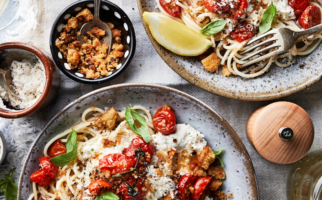 Deze pasta met ricotta is precies wat je wil op een luie zondag of doordeweekse avond. Zo’n bord vol warme pasta met romige ricotta, zoete geroosterde tomaatjes en een knapperig kruimellaagje is comfort food op z’n best.