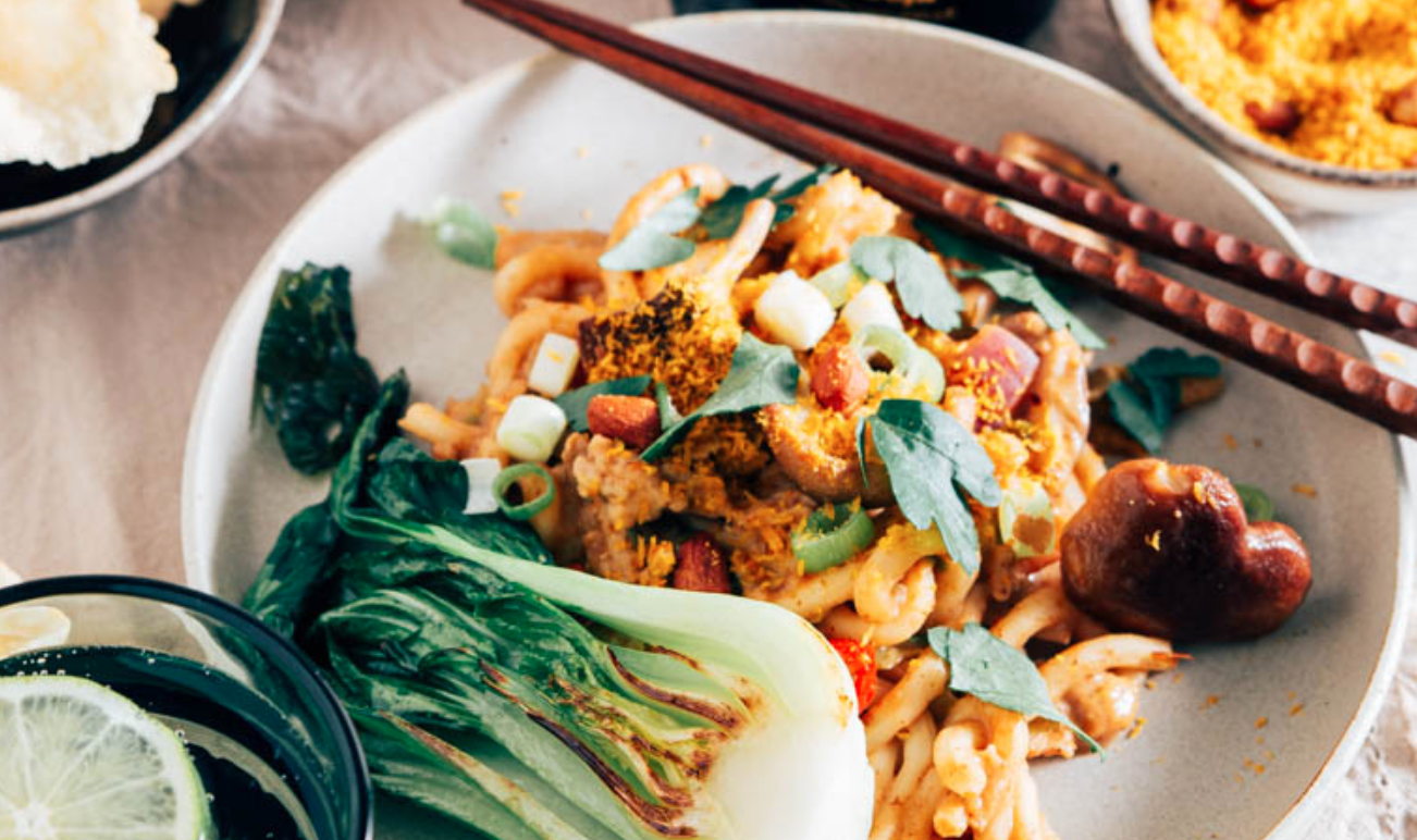 Saté noedels: bij ons thuis is dit zo’n gerecht waar we allemaal happy van worden. De dikke udon noedels slurpen lekker weg, en de kruidige kip en knapperige groente passen supergoed bij de romige, licht pittige pindasaus. En vergeet vooral die knapperige seroendeng en frisse koriander erover niet, dat maakt ’t helemaal af. Echt een fijn oosters maaltje dat je zonder moeite doordeweeks op tafel zet.