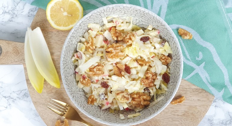 Ik heb een lijstje met recepten die ik ooit nog eens wil delen op optimavita.nl. Gezonde witlofsalade is er daar 1 van. Ik wil je heel graag laten zien dat je dit prima zonder veel mayo of andere vettigheid kan maken. Ik moet echter in de stemming zijn voor deze salade EN ik moet de tijd (en mooi licht) hebben om rustig te kunnen fotograferen. Om deze reden stond het serieus al een jaar of 2 op mijn to do list. Maarrrr….vandaag is het zo ver!