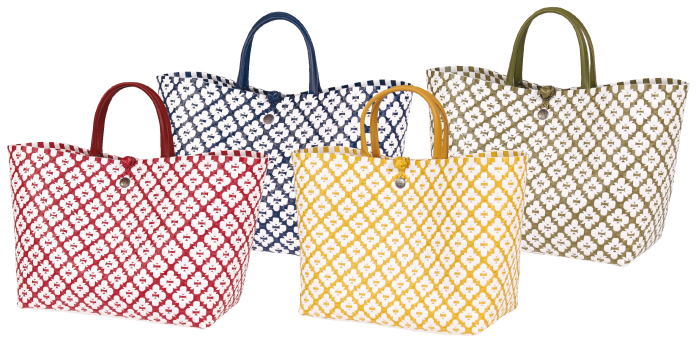 Badlaken, water, groente en fruit: met de PU leren, zachte hengels til je de tas zo op. Het unieke design is gebaseerd op de Portugese tegelpatronen, grafische elementen en heldere kleuren. Beschikbaar in vier verschillende kleurencombinaties, handgemaakt van 70 procent gerecycled plastic.