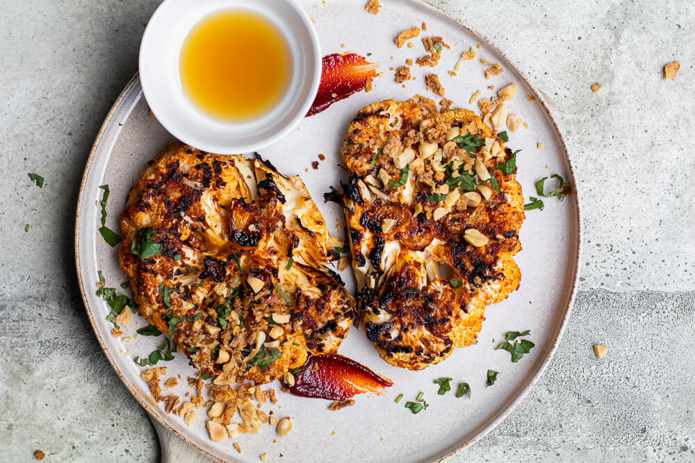 Vegetarisch barbecueën is écht niet moeilijk. Serieus, ik kan dit niet vaak genoeg zeggen. Nog steeds denken veel mensen dat de BBQ gelijkstaat aan stokjes saté, zompige hamburgers en kilo’s spareribs (inclusief marinade everywhere). Maar het is 2022 – álles kan op de barbecue. Aardappel, groente, fruit. Alles. Juist als je een beter verder denkt dan de bekende weg, is barbecueën heel verrassend. De afgelopen weken heb ik me weer helemaal uitgeleefd in de buitenkeuken (lees: het hoekje tuin waar de BBQ staat). Ik maakte onder andere deze bloemkool steaks op de barbecue! Simpel als wat: een bloemkool in plakken snijden, insmeren met een lekker sausje (ik maakte een mix van pittige rode currypasta en zoete ahornsiroop) en aan beide kanten een paar minuten roosteren op de barbecue. Oh en deze steaks zijn zelfs vegan!