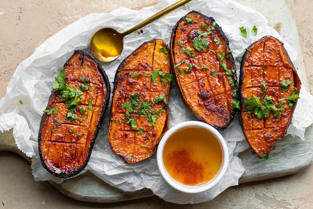 Download HealthyApp nu gratis voor iPhoneZoete aardappels van de barbecue met honing en chili
