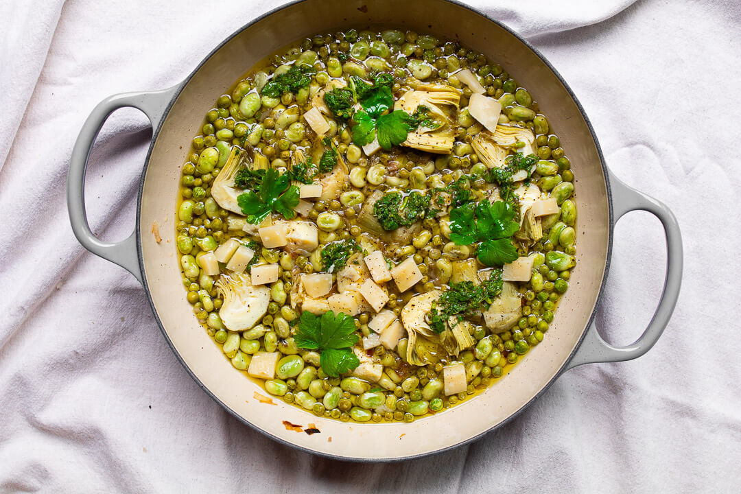 Een klassieke Siciliaanse fritedda maken we met verse tuinboontjes én verse artisjokken, maar.. ik was al een half uur kwijt aan het doppen van mijn bonen en heb daarom heel lui artisjokharten uit blik gebruikt ;) Deze smaakvolle Italiaanse stoof staat binnen 20 minuten op tafel wanneer je kant en klaar gepelde tuinbonen gebruikt, maar mocht je verse tuinbonen kunnen vinden, dan raad ik je zeker aan die te gebruiken! Verse tuinboontjes hebben meer smaak en net even wat meer bite. Maar kant en klaar gedopte tuinbonen kunnen natuurlijk ook. Wat de kruidenolie betreft: sla deze zéker niet over. De frisse olie geeft de stoof net even die laatste finishing-smaak-touch. Je maakt ‘m heel easy van goede extra vierge olijfolie, verse munt en citroen.