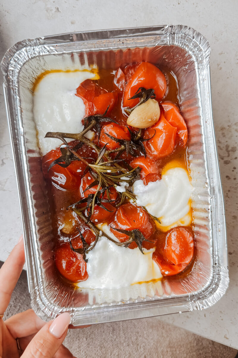 Want dit is zo’n barbecue bijgerecht dat je vaker wilt maken. Rijpe zoete tomaatjes, langzaam gegaard in een bakje op de barbecue, waardoor al die zoete sappen zich mengen met goede olijfolie, balsamico en een snuf lekkere kruiden. Garneer de tomaatjes – nog warm! – met een flinke klodder koele gezouten yoghurt. Die combinatie van warme balsamico tomaatjes en frisse yoghurt is zó lekker. En echt perfect om te dippen met flatbread van de barbecue. Makkelijk te maken, binnen één minuut in elkaar gezet en weer eens iets anders dan de standaard BBQ bijgerechten.