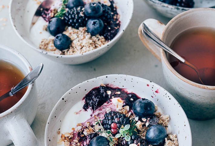 Of dit echt een recept is? Dat weet ik niet maar voor een ontbijtje wil je vooral niet iets te ingewikkelds, ik tenminste niet. Dit ontbijtje kun je lekker van te voren maken en de homemade fruitcompote kun je natuurlijk ook op je boterham smeren of op een plak cake! Of als toetje met vers fruit serveren. Het is heel gemakkelijk te maken, maar het kost je wel even tijd om de bevroren bramen tot jam te koken. Ik gebruik in dit recept geen suiker maar ahornsiroop. Dat geeft een lekker karamelachtige smaak en aan de fruitcompote voeg ik ook nog een beetje kaneel toe, zo wordt ‘ie net een beetje lekkerder vind ik. Maak je deze compote van ander fruit dan zou ik de kaneel weglaten, het is vooral lekker bij bramen en blauwe bessen.
