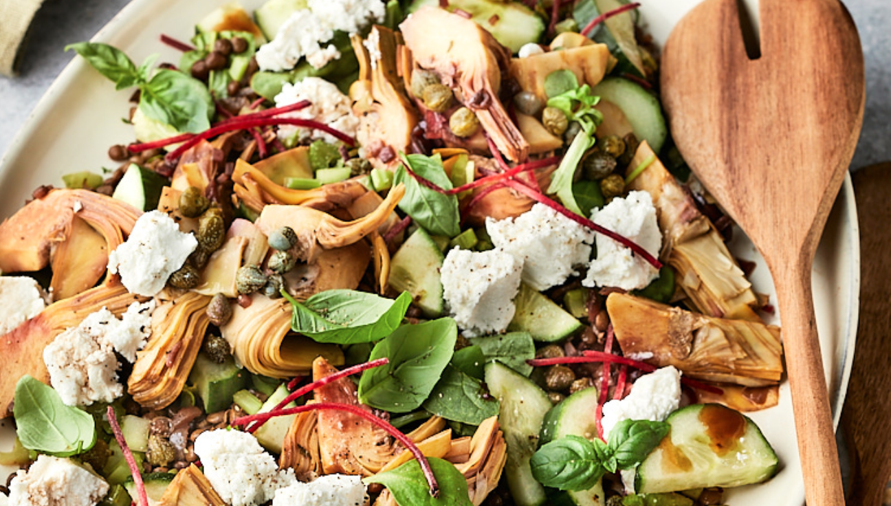 Deze artisjok salade is een verrukkelijke salade die je in een handomdraai op tafel tovert. Lekker Frans, met gemengde sla, linzen en artisjokharten uit pot. De balsamico-azijn en rode ui geven een friszure twist, en knapperige bleekselderij en komkommer zorgen voor de nodige crunch. Top de salade af met kappertjes, verse basilicumblaadjes en romige geitenkaas. Wie zei dat salades saai waren?!