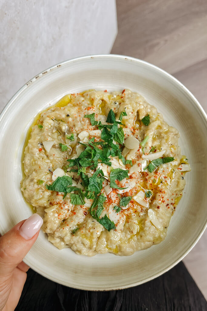 De basis van baba ganoush bestaat uit aubergines, citroen, sesampasta en komijnpoeder. De klassieke combi, die je zelf vervolgens kunt opfleuren met eigen smaakmakers. Zo vind ik het altijd lekker om er een beetje pit aan toe te voegen in de vorm van chili flakes. Voor een kleine bite strooi ik er wat (geroosterd) amandelschaafsel over en voor de frisse touch is fijngehakte verse munt erg lekker! Geniet ervan. Ik serveer deze dip graag met flat bread, maar Turks brood, stokbrood of vers afgebakken focaccia is ook top.