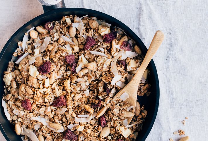 Ik kom er niet altijd aan toe, maar zelf granola maken is toch echt het allerlekkerst. Je kunt hem precies zo maken zoals jij wilt, met je favoriete ingrediënten. Deze granola met gedroogde frambozen en witte chocola is mijn nieuwe favoriet. Ik voeg er ook nog wat kokos, amandelen, honing en kaneel aan toe. Voor de basis gebruik ik havermout. Maar je kunt allerlei smaakmakers gebruiken natuurlijk. Denk aan hazelnoten, pecannoten, pure chocola, rozijnen of gepofte boekweit.