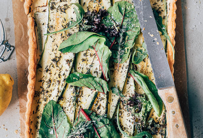 Een heel mooi en lekker hartig en vegetarisch taartje gemaakt van bladerdeeg en courgette. Ik ben gek op dit soort snelle taartjes. De truc voor een extra knapperige bodem is om het bladerdeeg even blind voor te bakken. Al werkt een beetje paneermeel op de bodem ook goed. Daarna vul je deze bladerdeegtaart met courgette met een heerlijke romige geitenkaasvulling. Waarbij je gemakkelijk de geitenkaas, crème fraîche en eieren losklopt. Let er wel op dat je zachte geitenkaas koopt, harde stukjes laten zich onmogelijk kloppen tot een gladde mooie vulling.