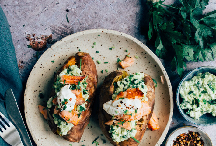 Download HealthyApp nu gratis voor iPhoneGepofte zoete aardappel met avocado en zalm + Wil jij een Airfryer testen?