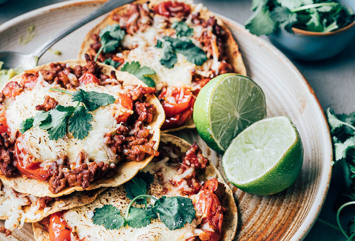 Ik ben echt in love met Mexicaans eten. Of dat nou een stoofgerecht met kip is, enchiladas, tortilla’s, een lekkere mole of pittige salsa – ik vind het allemaal helemaal te gek. Dat heb ik wel vaker, dat ik dan een bepaalde periode helemaal in zo’n keuken duik. Voor vandaag dus een Mexicaans receptje: tostadas met gehakt. Tostada is een geroosterde of gefrituurde Mexicaanse tortilla. Het kan zo worden gegeten, maar meestal gebruik je het met beleg, zoals je ook een tortilla belegt. In dit recept maak je razendsnel een lekkere tomatensaus met een Mexicaans tintje en smelt je er in de oven, onder de grill, wat kaas over.