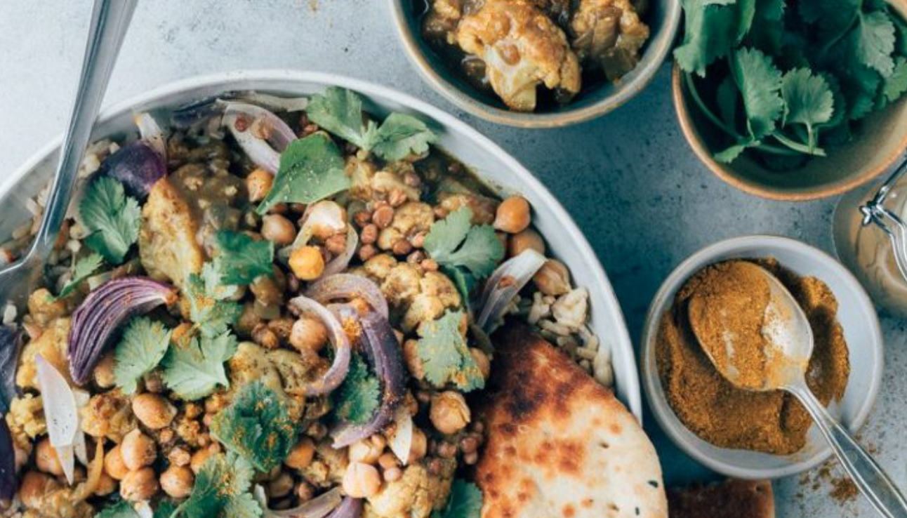 Vandaag een Indiase curry recept vol met groenten en helemaal vegetarisch. Lekker vol en romig van smaak door de kokosmelk en curry madras kruiden. In dit curry recept rooster je de linzen en kikkererwten in de oven voordat je ze door de curry heen mengt zodat ze een beetje knapperig worden. In deze Indiase curry gebruiken wij diepvries bloemkool, heel gemakkelijk wanneer je een week van te voren je eten plant en niet zoveel ruimte in de koelkast hebt voor een verse bloemkool. Natuurlijk kun je ook verse bloemkool gebruiken en zelf de roosjes er van snijden. Bak er een lekker naanbrood bij en garneer met verse koriander blaadjes.
