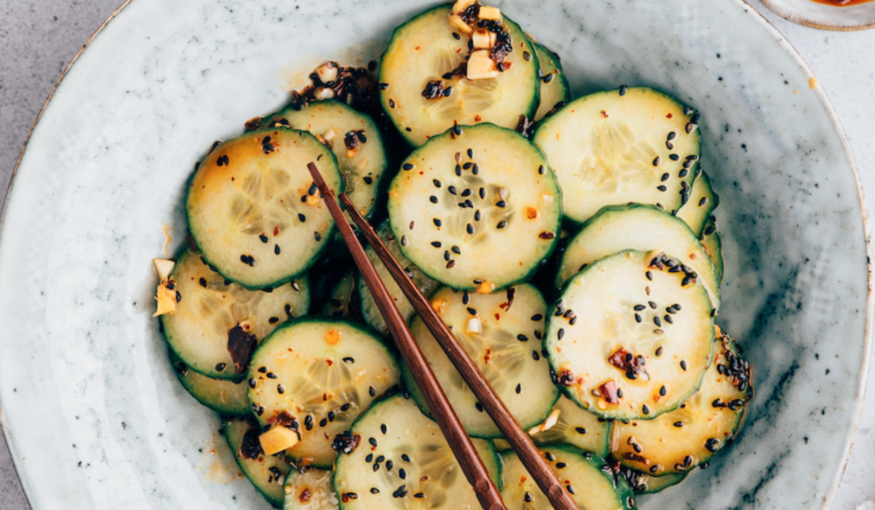 Deze Aziatische komkommersalade is fris én lekker spicy! Met dunne plakjes komkommer, een vleugje knoflook en gember, en een heerlijke dressing van sojasaus, sushi azijn, crispy chili olie en sesamolie, is elke hap een feestje. Een perfect bijgerecht voor bij Oosterse gerechten, bij de BBQ of gewoon als lichte en gezonde salade op een warme dag. Deze Aziatische komkommersalade zet je binnen 10 minuten op tafel. Sneller kan bijna niet, toch?