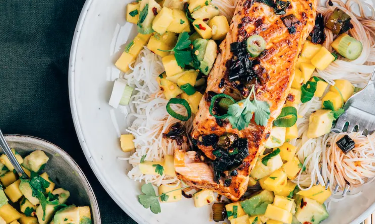 Mihoen met zalm: frisheid in een kom, met romige mango-avocadosalsa – én een pittige kick! Als basis gebruiken we mihoen; deze ragfijne rijst-vermicelli is trouwens ook ideaal in oosterse soepen en knapperige loempia’s… Kortom: duik in deze Aziatische mihoen bowl met gegrilde zalm, mango, avocado en chili-olie.
