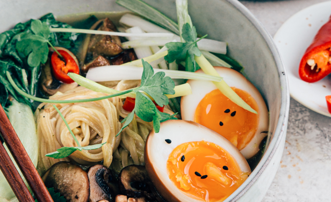 Of je nu vegetariër bent of gewoon zin hebt in een aromatisch soepje, deze hartverwarmende vegetarische noedelsoep is sowieso een aanrader! Het recept is eenvoudig en snel te bereiden, alleen de gemarineerde soja-eitjes kosten wat meer voorbereidingstijd – maak deze dus ruim van tevoren. Voeg gerust andere extra ingrediënten toe aan deze Aziatische noedelsoep: van je favoriete paddenstoelen tot bamboescheuten, of extra chili crisp.