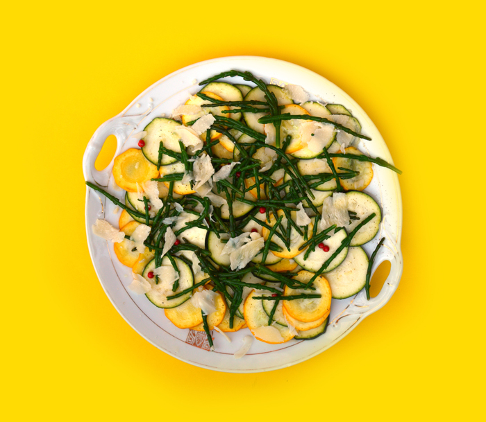 Tot ik ineens een potje ingemaakte zeekraal tegenkwam in de voorraadkast. Een souvenir uit Le Crotoy, een snoezig Frans vissersdorpje aan de baai van de Somme. Daar struikel je over de salicorne, zoals zeekraal heet in het Frans. Maar dan wel altijd in potjes met azijn, gek genoeg nooit vers. Die azijn zorgt voor lange houdbaarheid, maar ook voor een tikje mottig bruingroene kleur. Maar kijk, ik drapeerde de sliertjes over mijn courgettecarpaccio en ineens waren de oh’s en ah’s niet van de lucht.