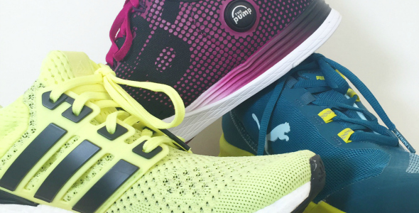 Graag stel ik jullie voor aan mijn nieuwe vriendinnetjes! Op links in het geel, Miss Adidas Ultra Boost. In het midden in het donkerpaars miss Reebok - beter bekend als The Pump. En tot slot de cougar van de groep: miss Puma Ignite XT. Je begrijpt, drie vriendinnen waar je echt niet zonder kunt!