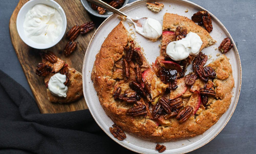 Deze appel kaneel galette met gekarameliseerde pecannoten is heerlijk voor bij de koffie of als dessert met een bolletje vanille ijs erbij. Een galette is een echte Franse klassieker. Je kunt ‘m het best beschrijven als een ronde open taart die je zowel met zoete als met hartige ingrediënten kunt vullen. (Vorig jaar maakte ik deze hartige variant met tomaat, honing en feta. Ook echt een aanrader om te maken!) Dit keer ging ik voor een zoete versie gemaakt met appelschijfjes, kaneel en gekarameliseerde pecannoten. Ook fijn: deze appel kaneel galette met gekarameliseerde pecannoten heb je echt zó gemaakt. Je rolt het amandeldeeg uit tot een ronde vorm (je hebt geen vorm nodig, alleen een bakpapiertje!), legt de ingrediënten erop en je vouwt de randjes van het deeg om. Verder doet de oven het werk voor je. Easy peasy right?