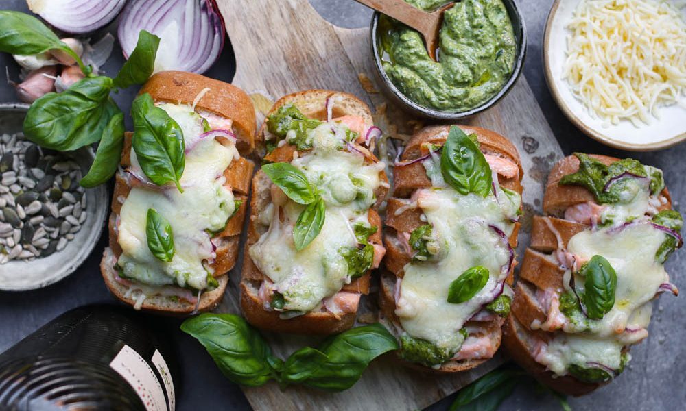 Deze glutenvrije broodjes gevuld met zalm en pesto uit de oven zijn echt fantastisch als hapje voor bij de borrel. Ze zijn luchtig, hebben een heerlijk kaaskorstje en ze zijn super eenvoudig te bereiden. Ik kwam deze borrelbroodjes afgelopen zomer tegen in viswinkel Schuitemaker in Katwijk aan Zee, toen Mike en ik voor het eerst met baby Louen een weekje op vakantie in eigen land waren. Je koopt deze broodjes kant-en-klaar gevuld en bakt ze vervolgens zelf thuis af in de oven. Handig toch? Dat vonden wij ook, maar helaas had ons strandhuisje geen oven ;). Daarom vroeg ik hen om het recept waarna ik thuis aan de slag ging met een eigen versie. Een glutenvrije versie welteverstaan! Het resultaat zijn deze glutenvrije ciabatta’s uit de oven gevuld met verse zalm, groene pesto en daaroverheen geraspte kaas. Heer-lijk